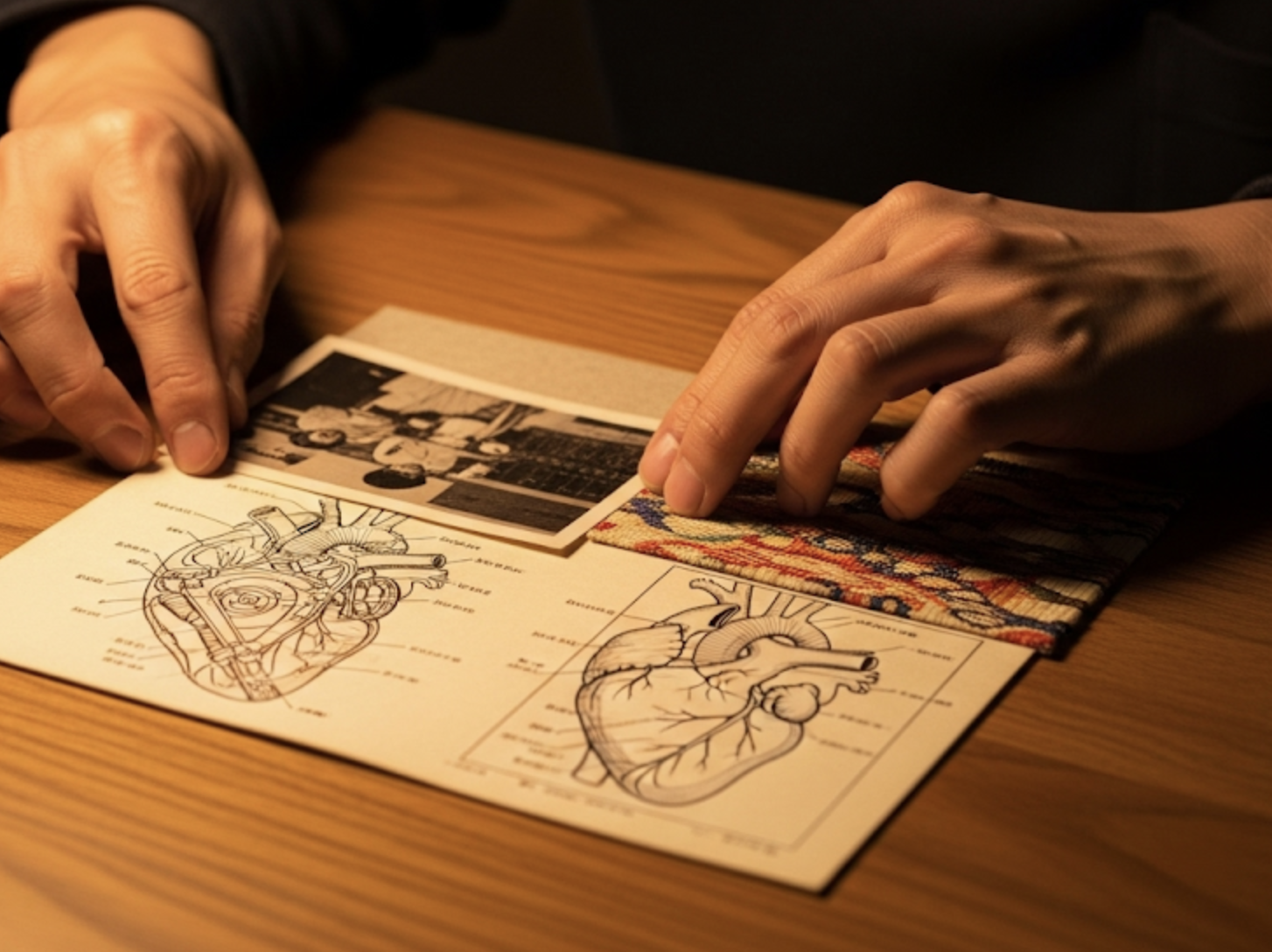 その名の通り、写真や雑誌の切り抜き、壁紙、布など、様々な素材を台紙に貼り合わせて一つの画面を作り上げる技法です。